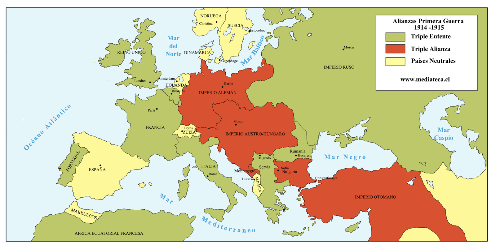 Entente: Reino Unido, Francia y Rusia. Imperios Centrales: Alemania, Austria-Hungría y el Imperio otomano.
